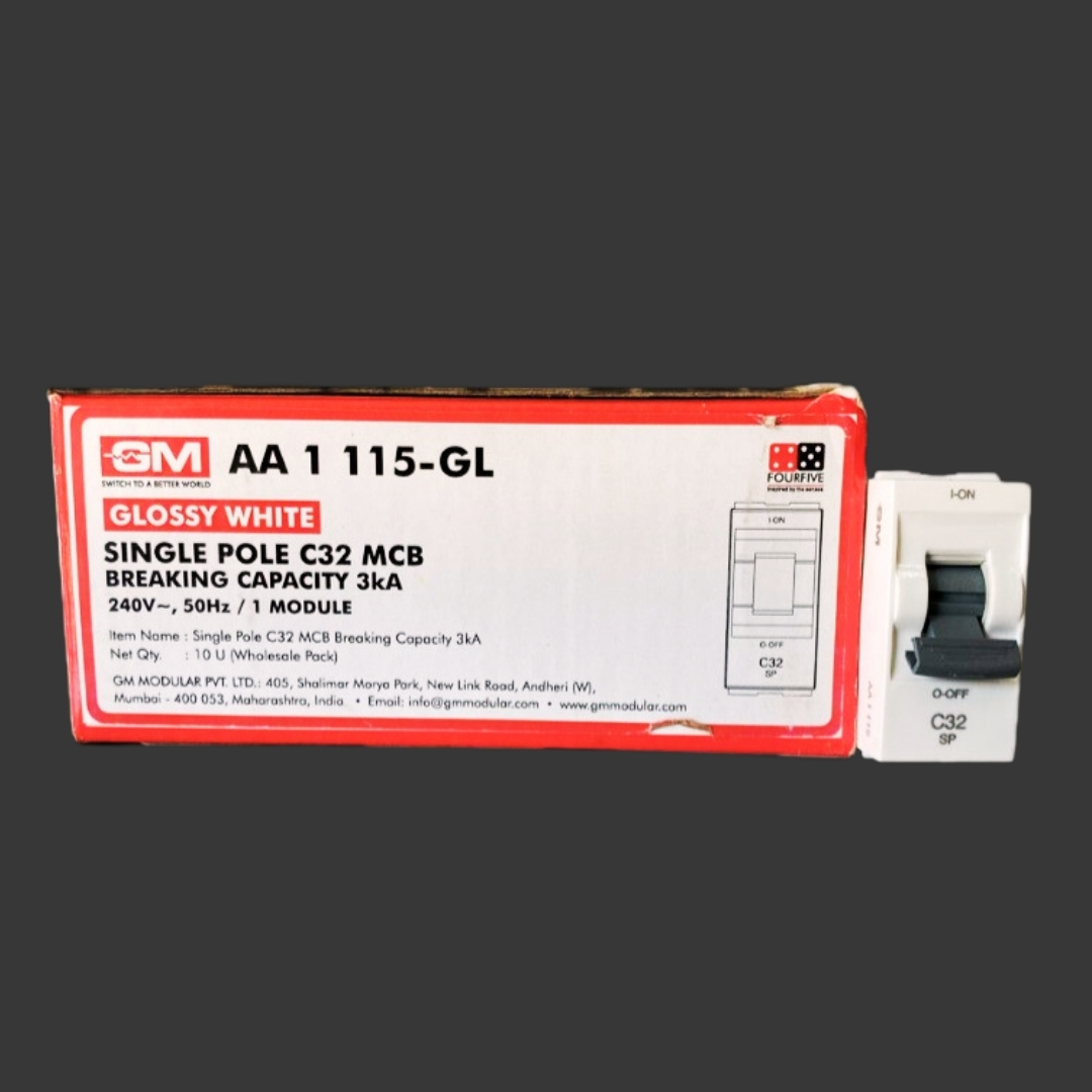 - GM Fourfive C32 Single Pole MCB in premium glossy white finish.